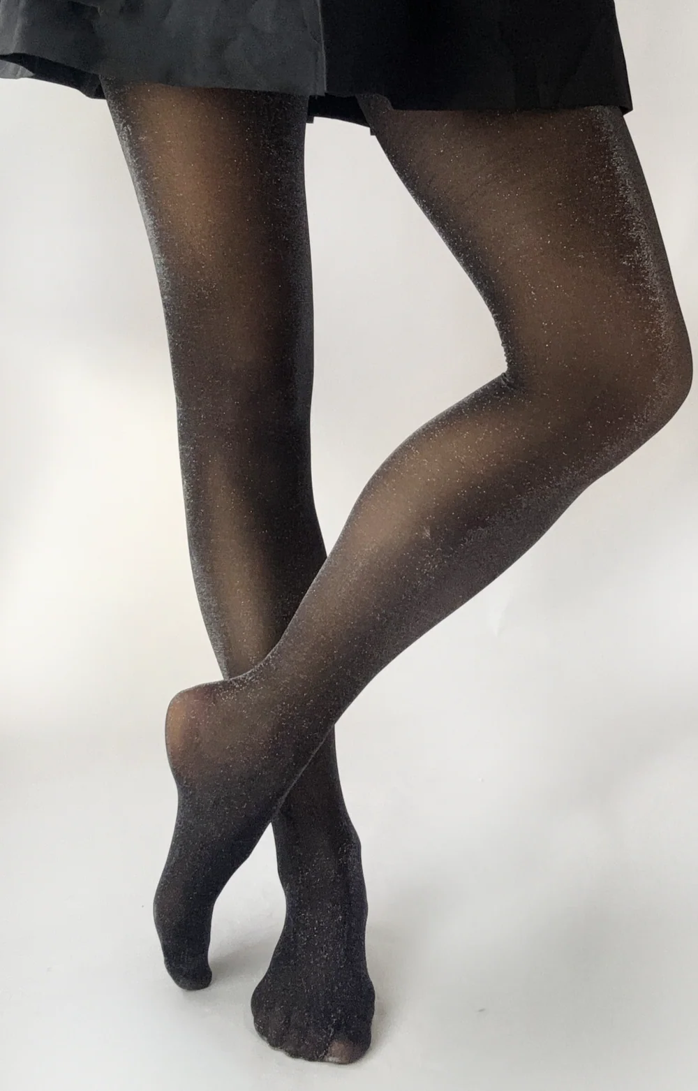 Die transparente schwarze Strumpfhose ist mit feinen metallischen Glitzerfasern durchzogen und verleiht deinen Beinen einen edlen, schimmernden Look, der bei jeder Bewegung dezent funkelt.
