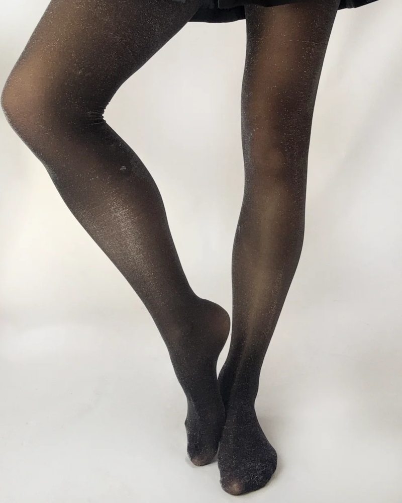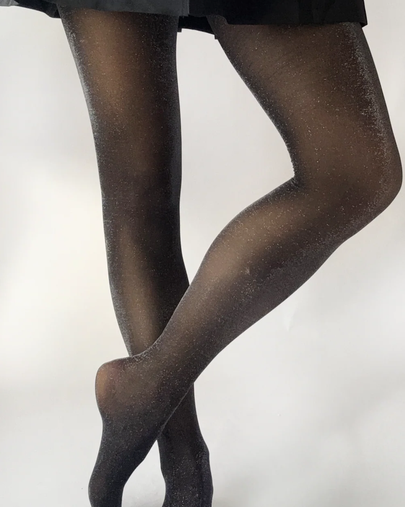 Diese transparenten schwarzen Strumpfhosen sind mit feinen metallischen Fasern durchzogen und sorgen für ein elegantes, schimmerndes Finish, das bei jeder Bewegung das Licht einfängt.