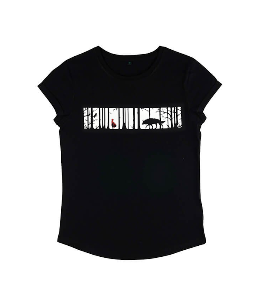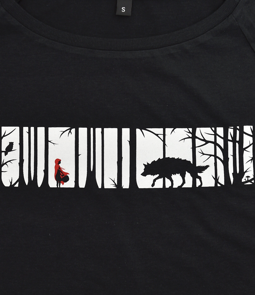 Dieses schwarze Damen-T-Shirt begeistert mit einem außergewöhnlichen Rotkäppchen-Print im grafischen Design.
