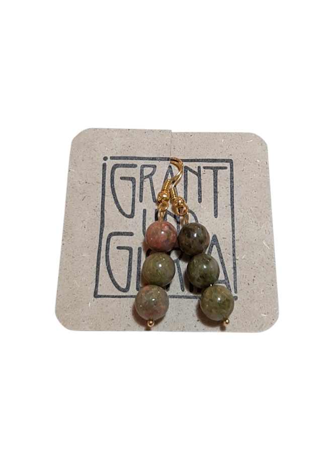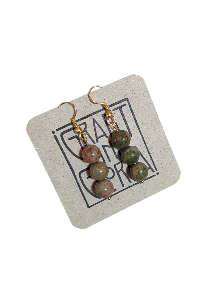 Diese handgemachten Ohrringe mit Halbedelsteinen mit jeweils drei runden Halbedelsteinkugeln, übereinander angeordnet bilden ein harmonisches Design.