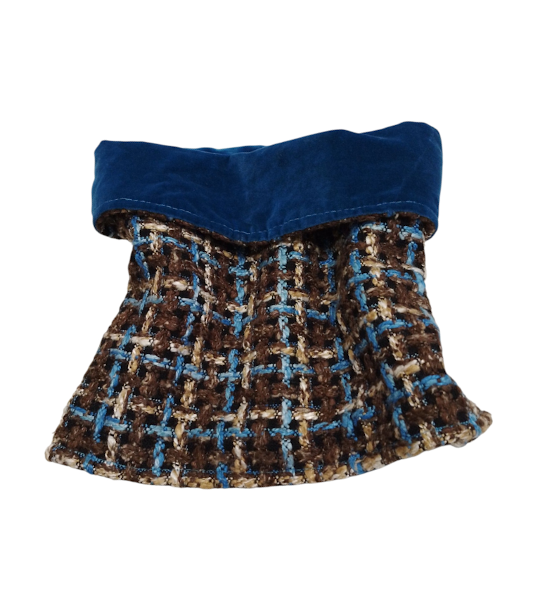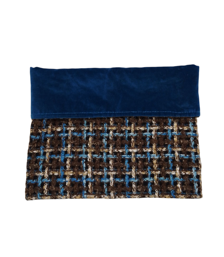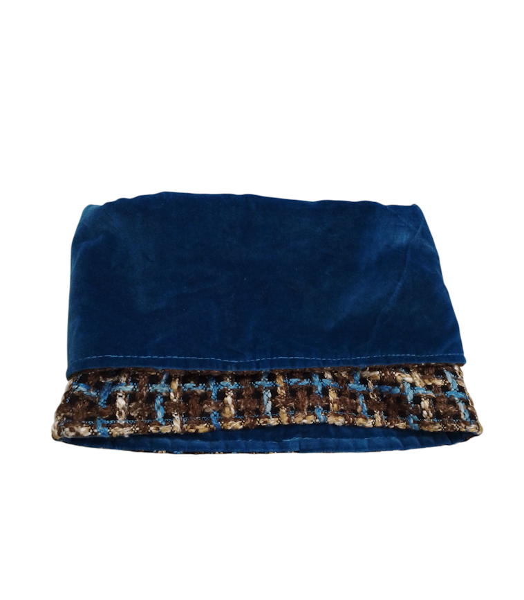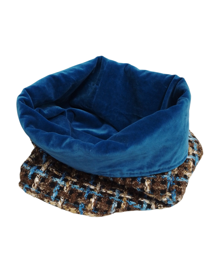 Eine Seite ist samtigweich und aus blauem Samtstoff, die andere kariert aus Wolle
