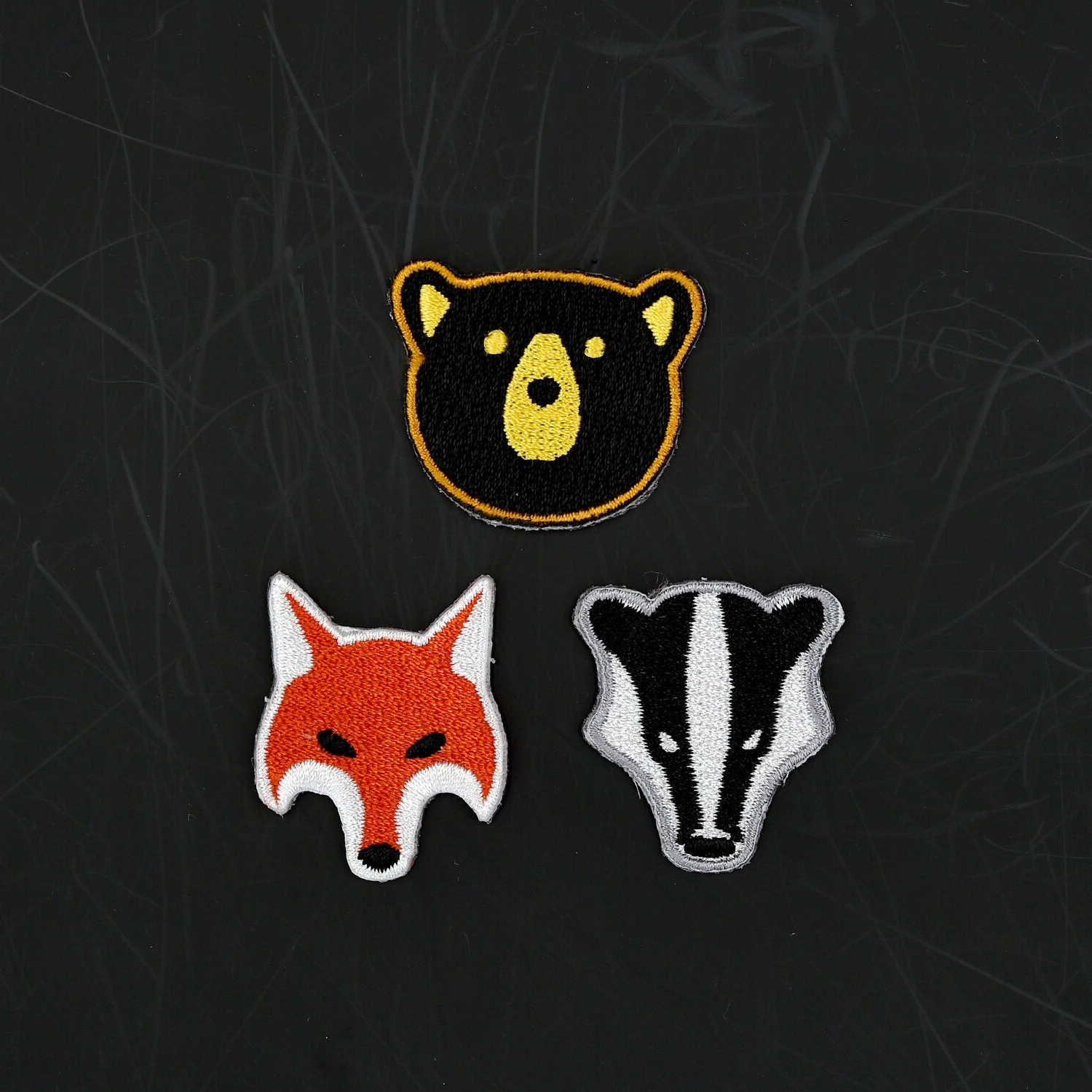 Dieses Set enthält drei hochwertige Tier-Patches – Bär, Fuchs und Dachs –