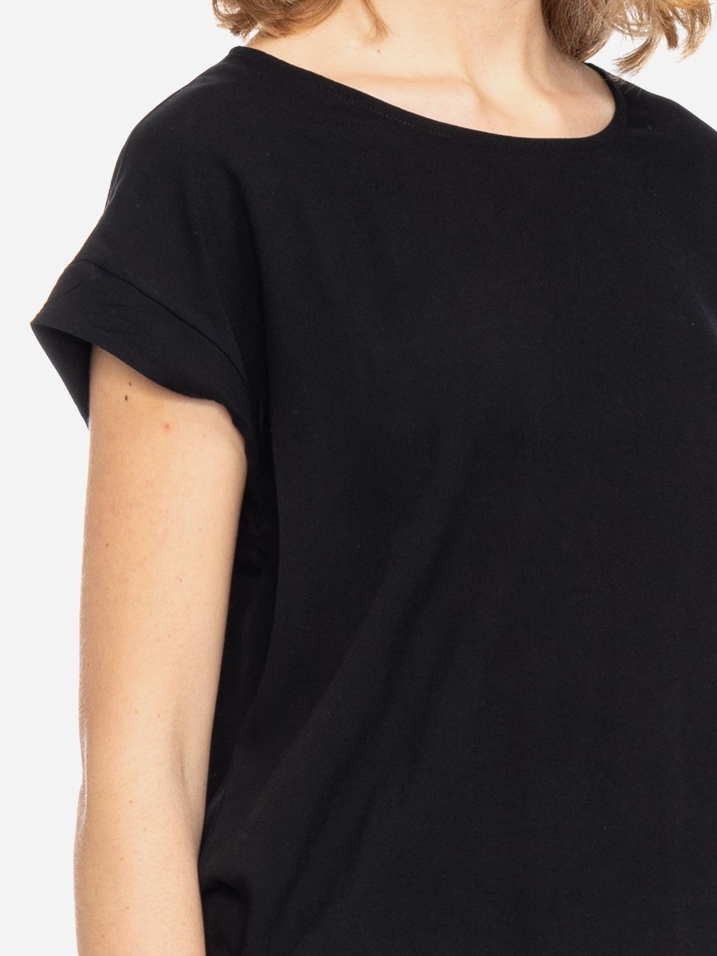 Der runde Halsausschnitt, sowie die kurzen, angeschnittenen Ärmel machen das Top zu einem Must-Have für die warme Jahreszeit