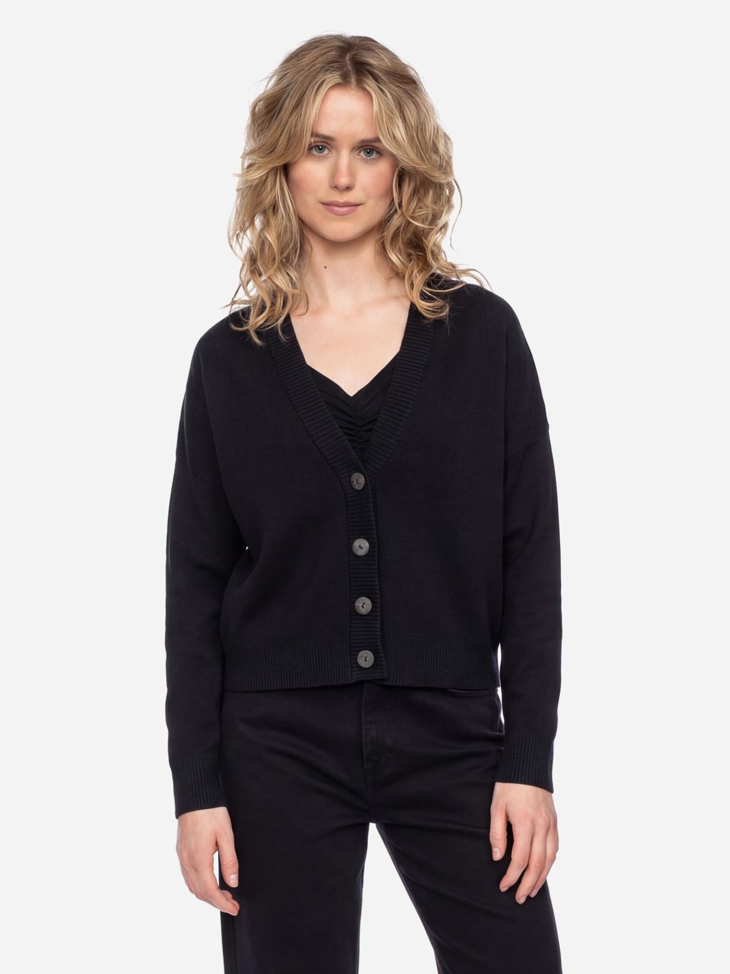 Der etwas kürzere Schnitt mit klassischem V-Ausschnitt macht Smilla zu einem vielseitigen Kombi-Teil – ob über Kleidern, Tops oder Blusen.