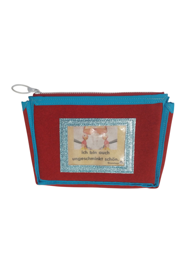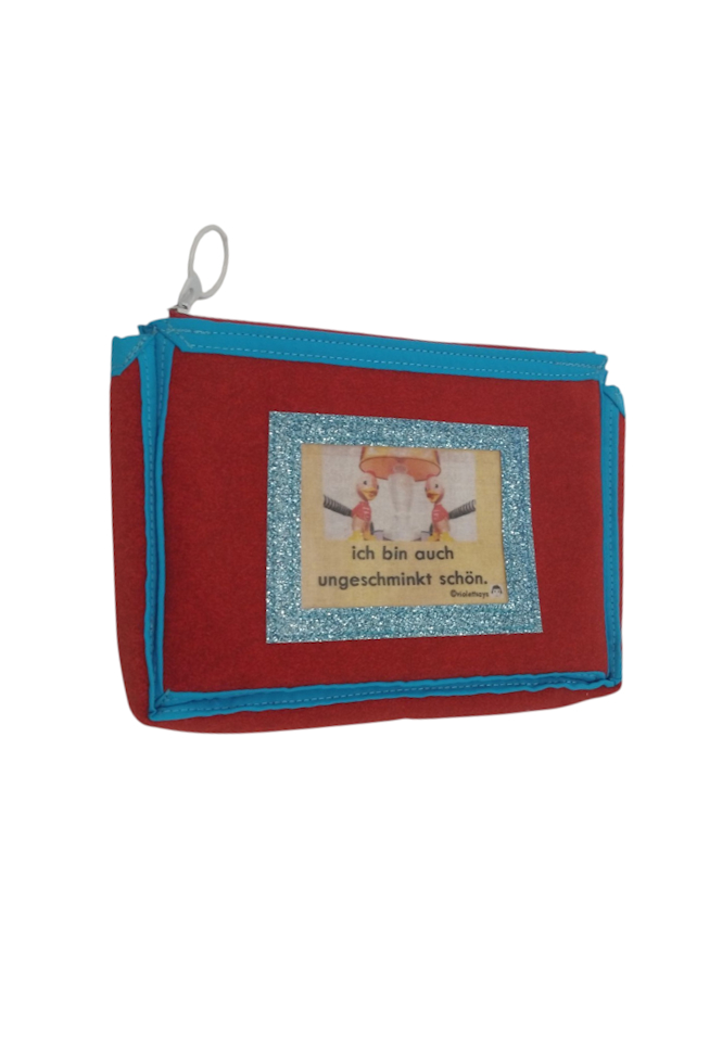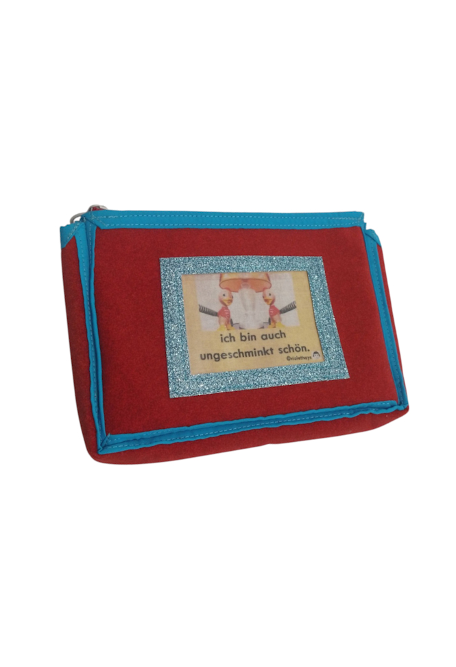 Praktisches Täschchen aus Kunstleder und Stoff mit dem Spruch „ich bin auch ungeschminkt schön“