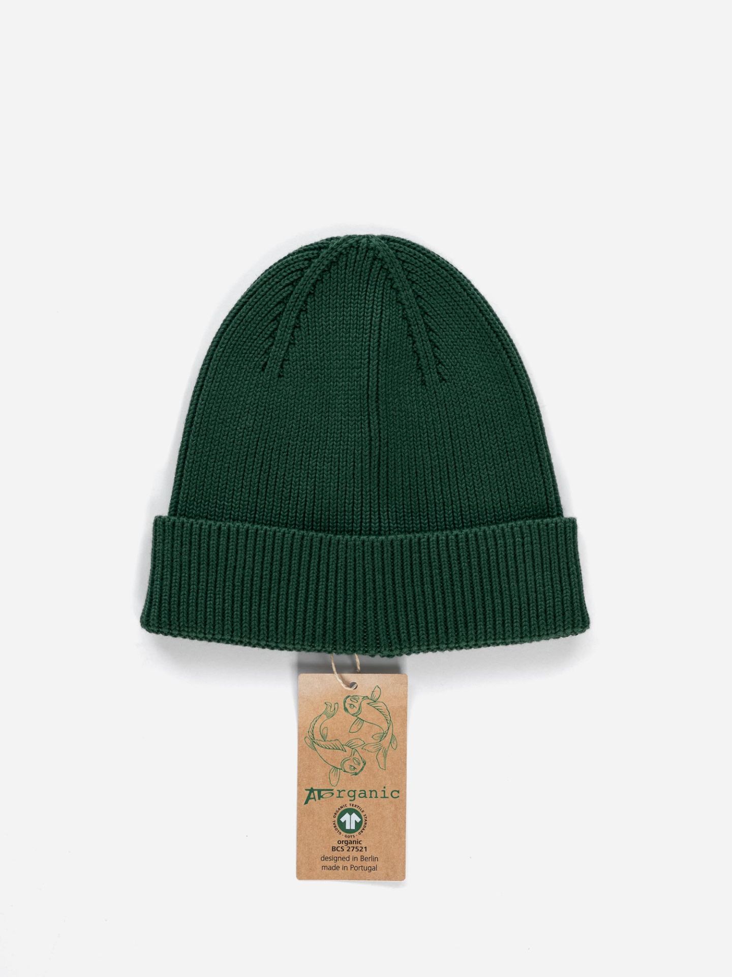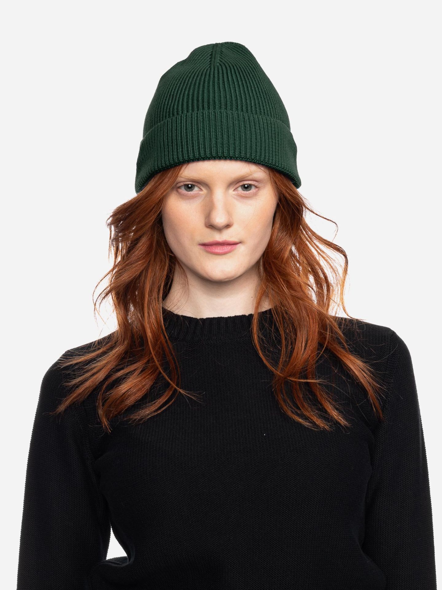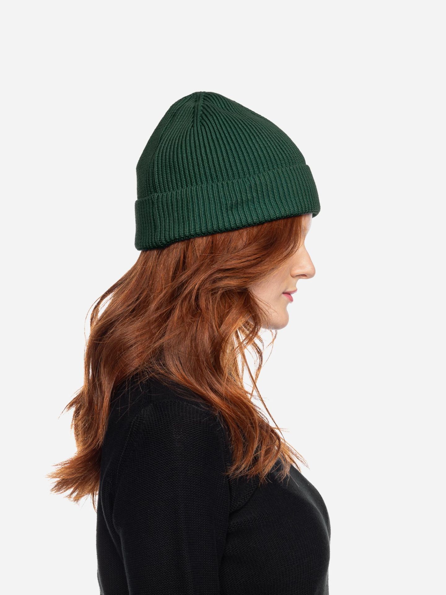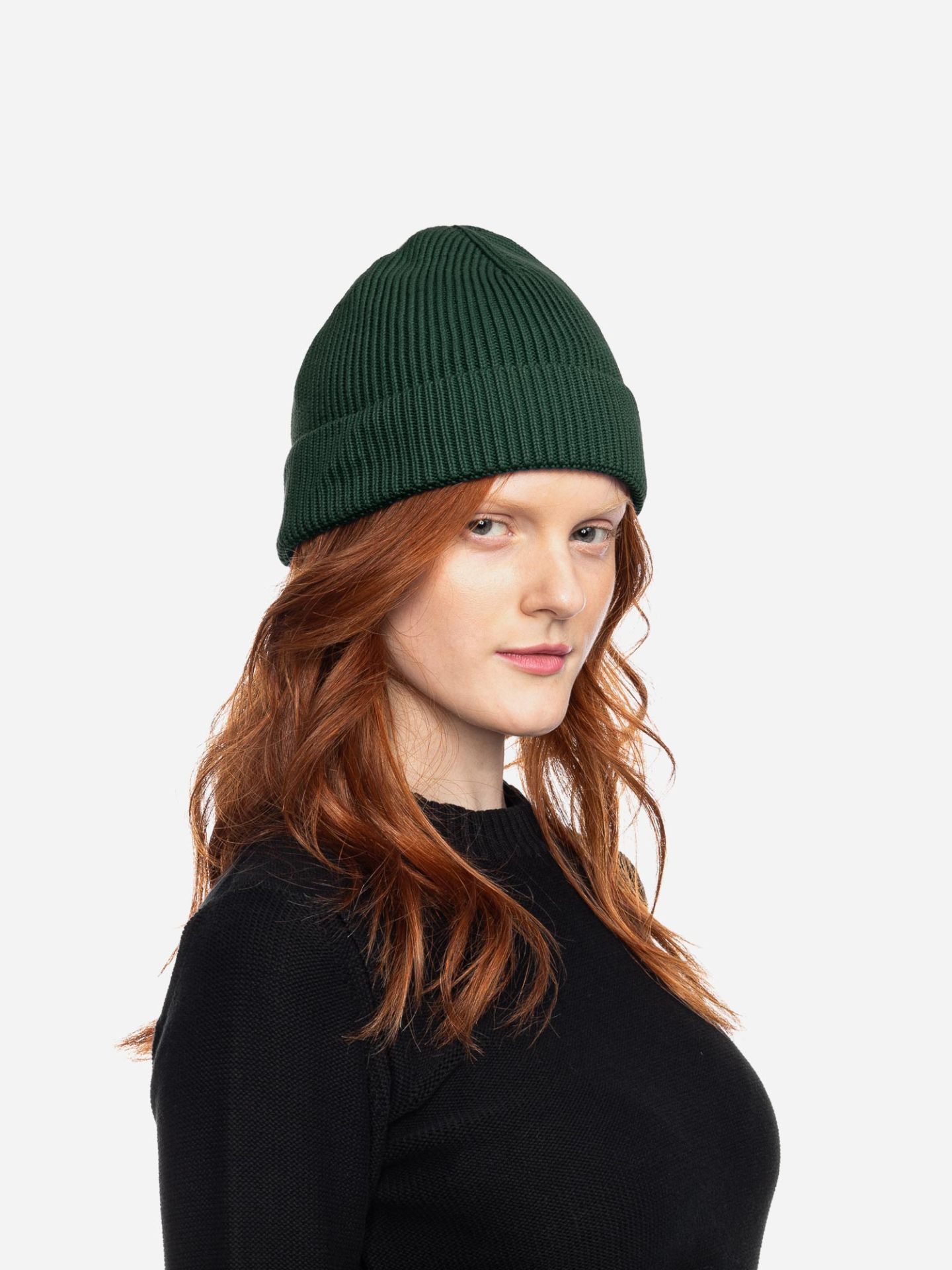 Diese Strickmütze überzeugt mit ihrer klassischen Rippstruktur und einem dunklerem Grün.